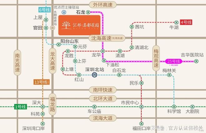 项目位于龙大高速水朗出口旁,邻近地铁6号线号线号线(已开工在建)。畅享龙大、南光、广深、沈海(机荷)四大高速路网,社区接驳优点巴士,6条短线大地铁站(阳台山东、龙胜、元芬地铁接驳已开通)、3条快线直达车公庙(已开通)/科技园(已开通)/大剧院等中心区。(深圳宝安汇邦名都花园售楼处官方电话:)