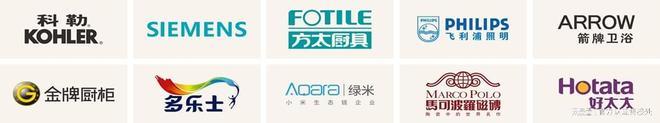 品牌家居:方太厨具三件套、TOTO 卫浴、金牌橱柜、欧普灯具、箭牌浴柜、索菲亚鞋柜& 收纳柜等;